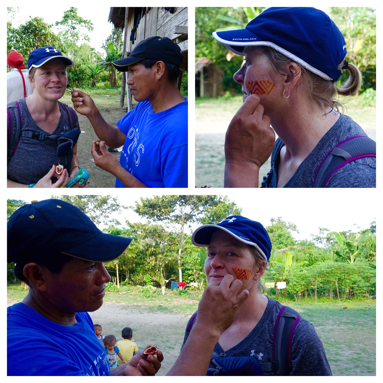 In the afternoon we took a motorized canoe down the river to visit a local Quichua family. We got to see how they live off the land and farm goods like cacao for sale. They welcomed us into their home and we learned of their customs and tasted some sweet plantains that had just been roasted on the fire. Ramon painted my face with the colored paste from a seedpod he picked up from the ground.