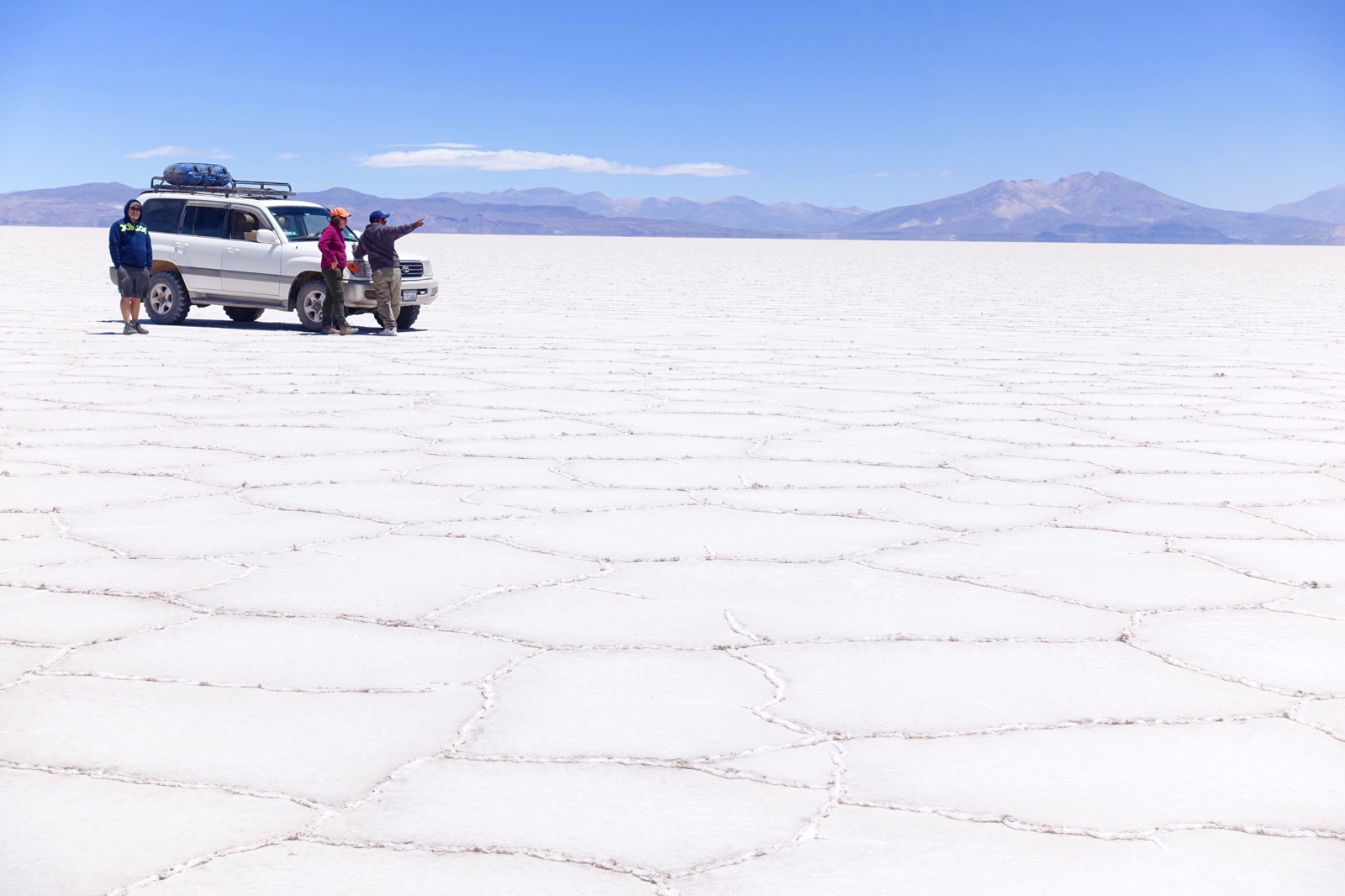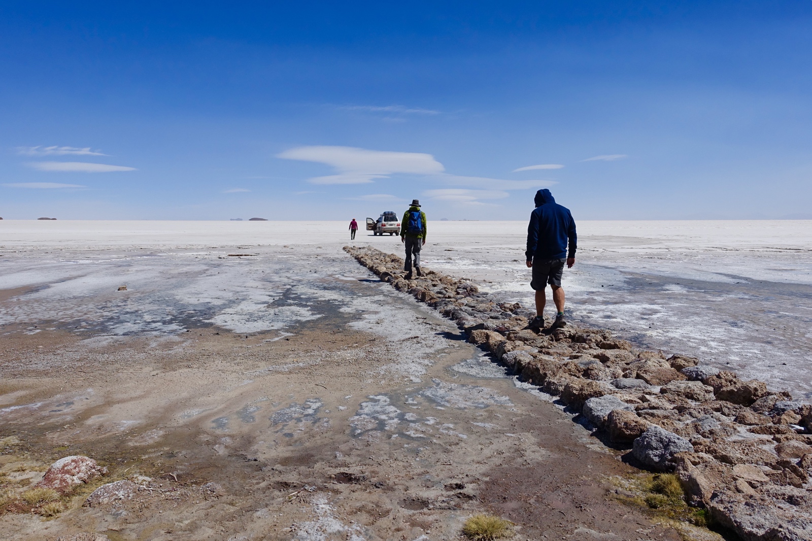 Hiking back out to our ride after visiting the hidden cave. The salt gets thin near the “shore” so the trucks can’t drive on it.