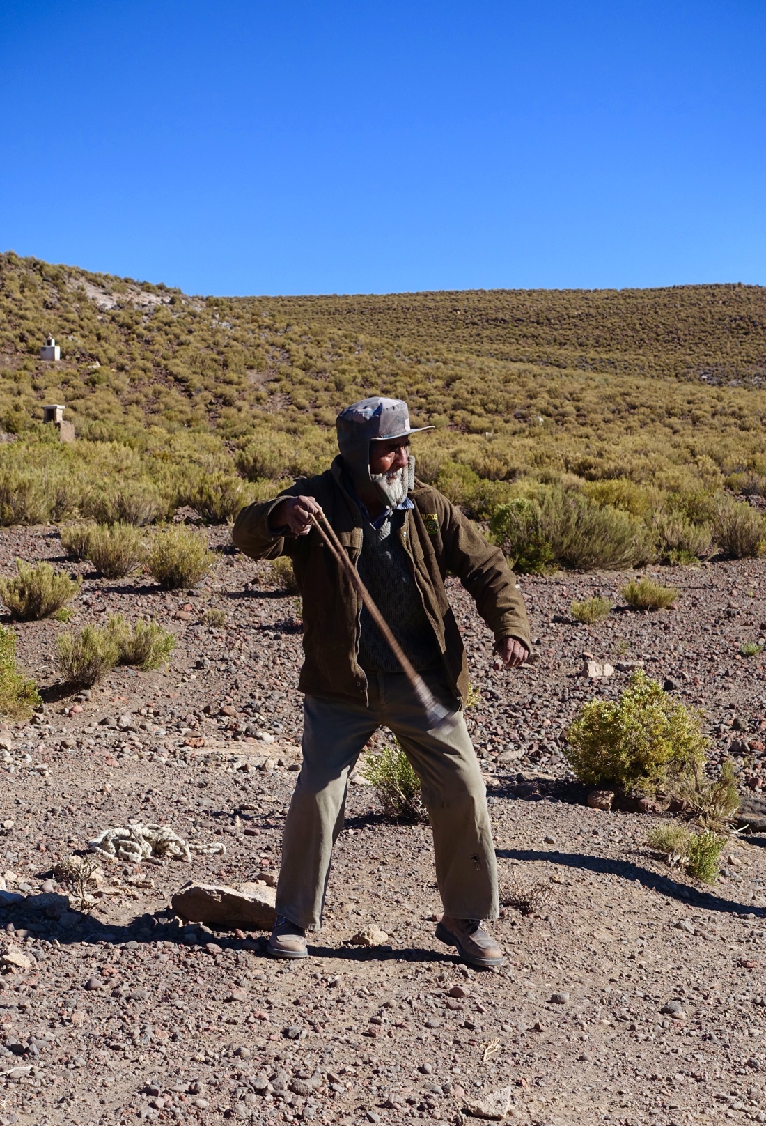The llama shepherd showing us how to throw rocks with a sling. We could get them to go a few feet, he sent them sailing for yards and yards with amazing accuracy and power.