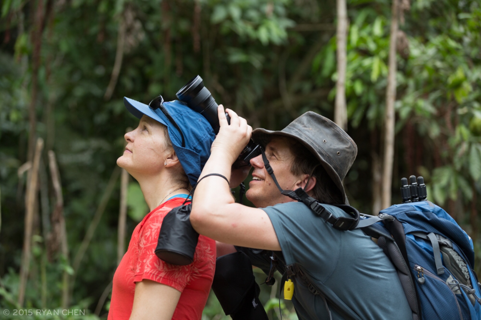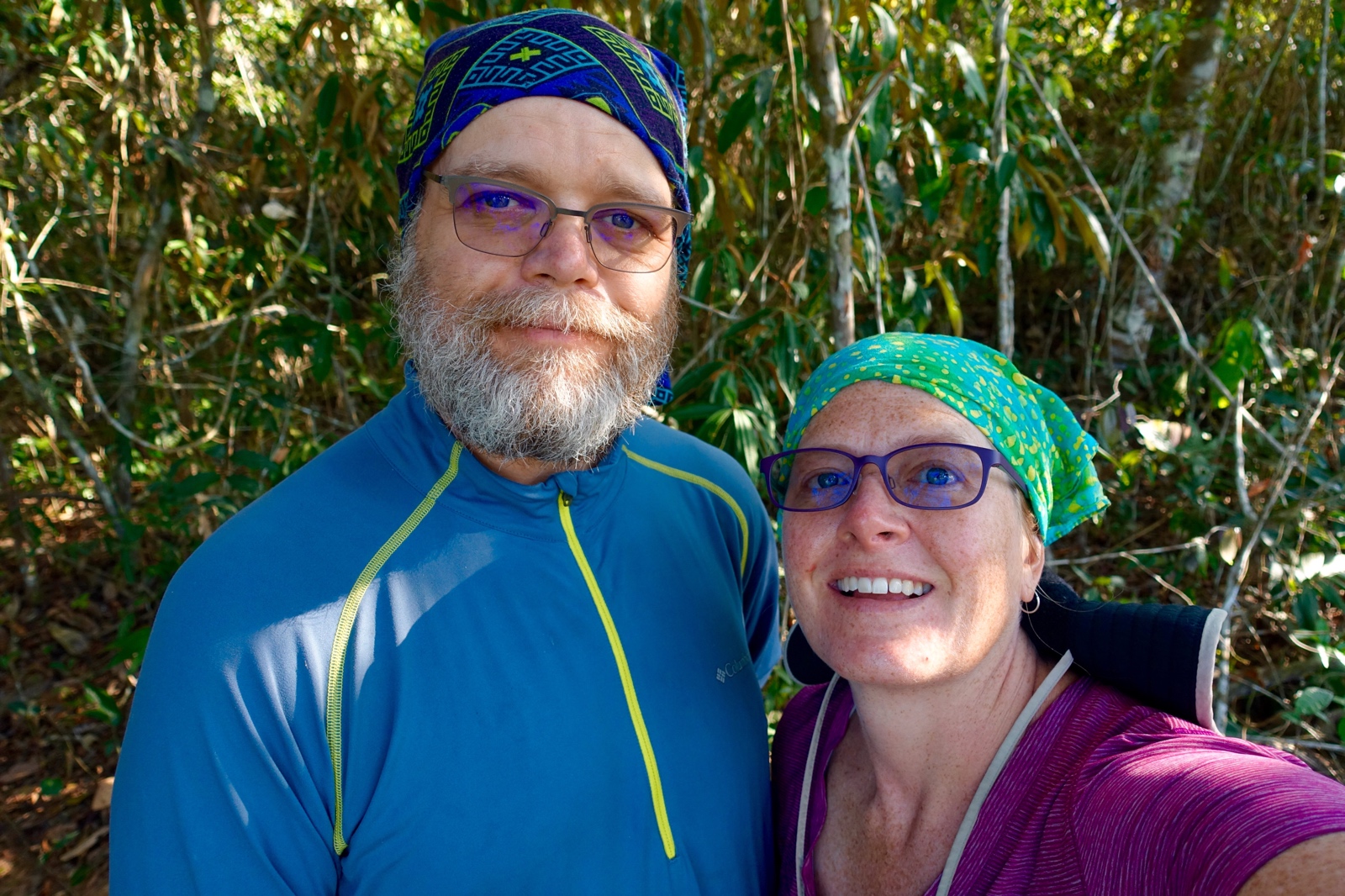 Chris and Darlene hiking through the jungle…on the hunt for smelly pigs.