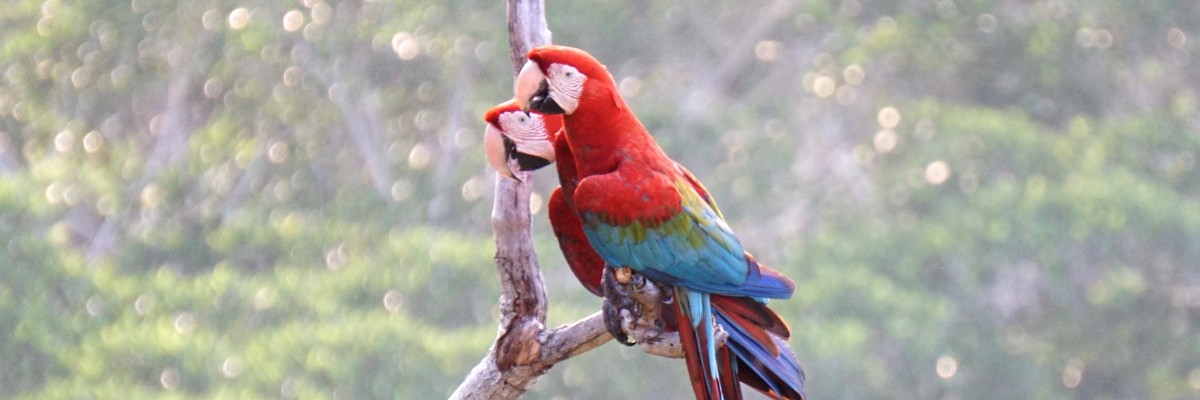 A pair of red and green macaws soaring above the jungle canopy. (Photo by Chris)