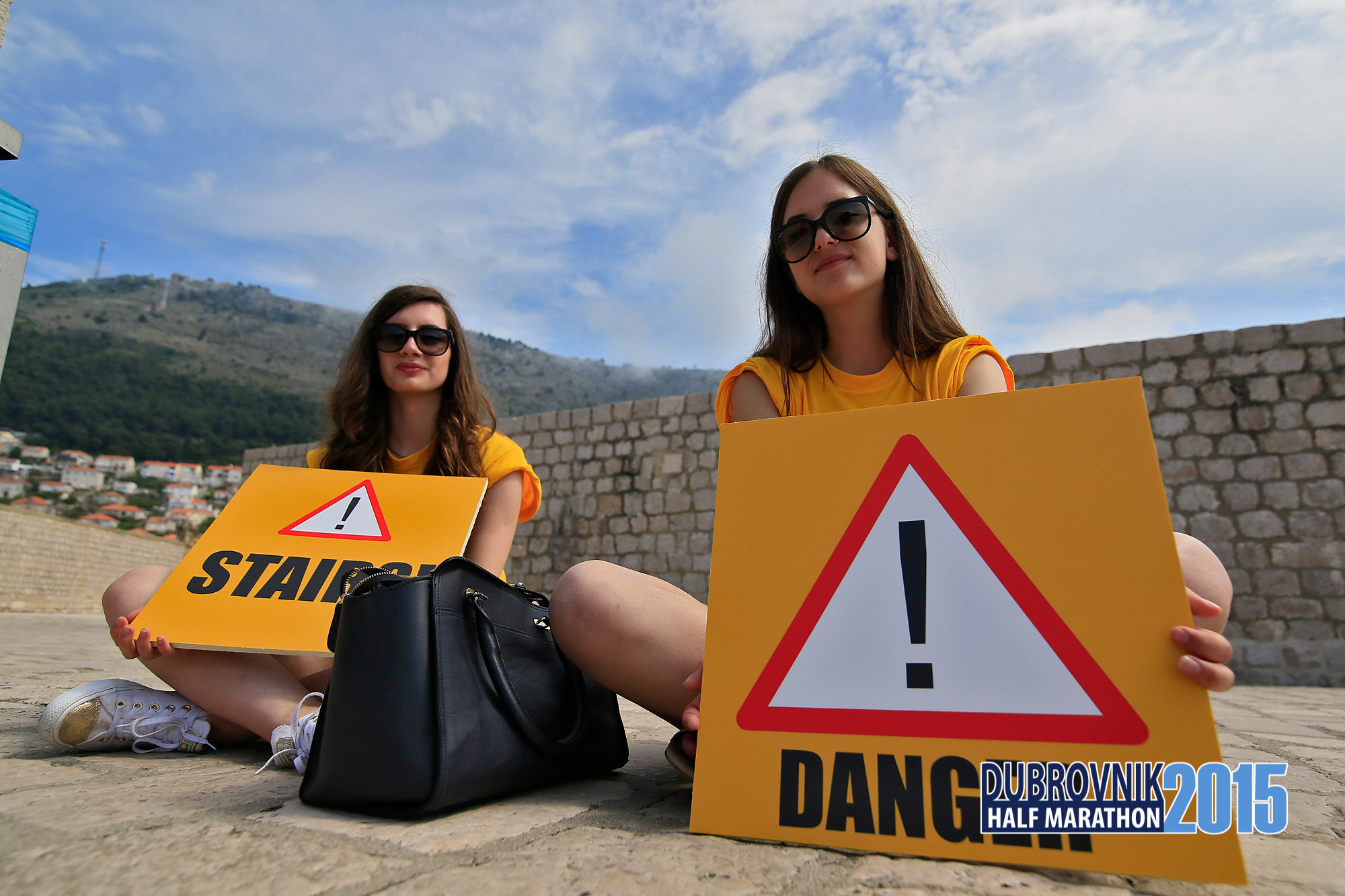 As to be expected, the ancient walls were very precarious to run on. Slippery polished marble stones, uneven stairs, rutted cobblestones and falls to your death on the sea cliffs below, etc. There were a bunch of volunteers (in the form of somewhat bored teenagers) with these helpful signs all along the route.