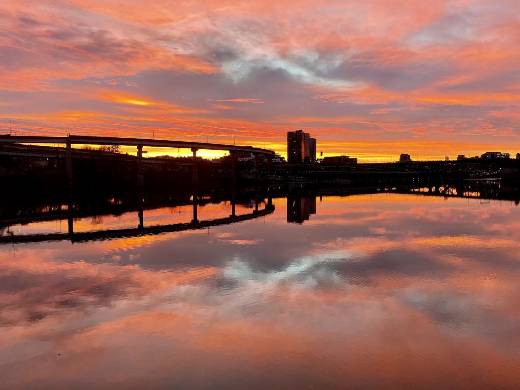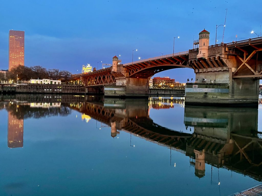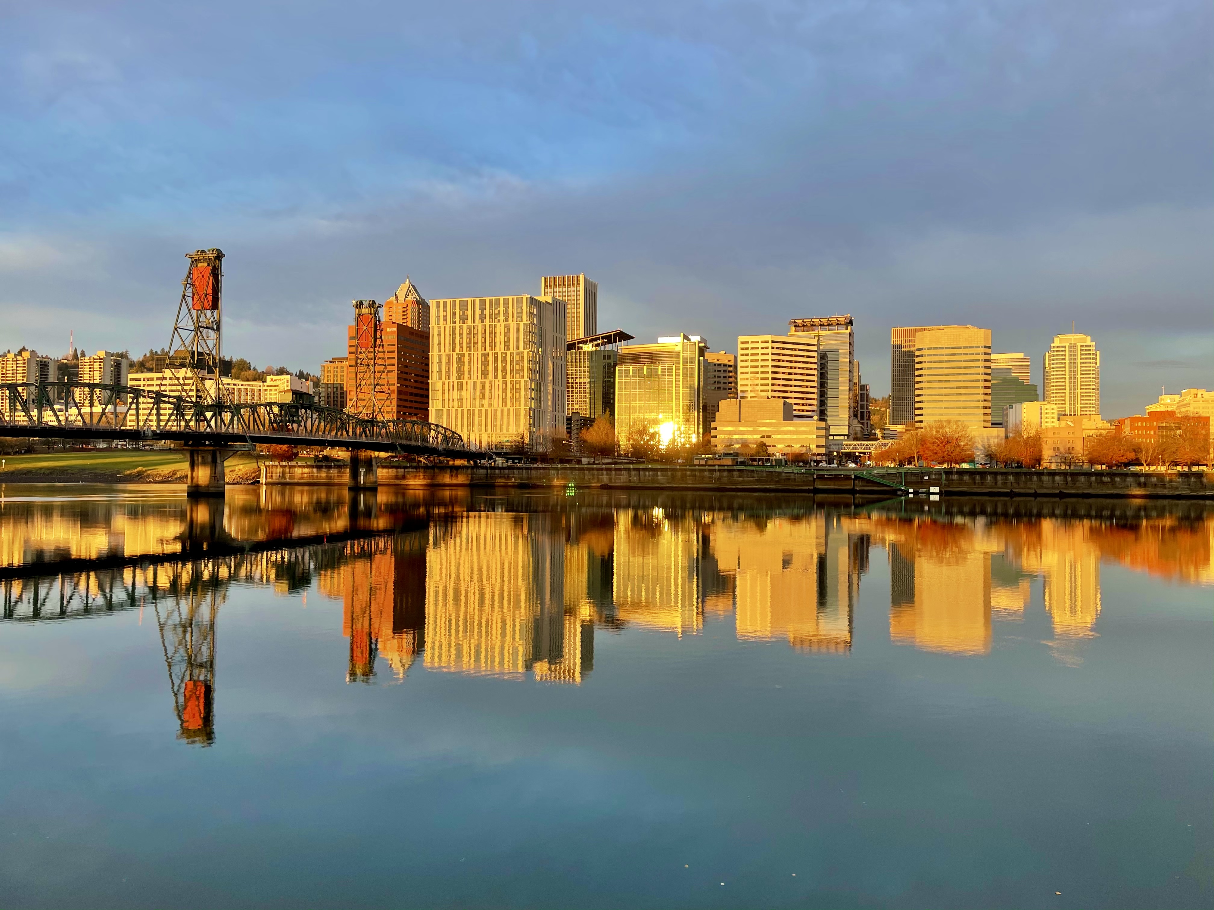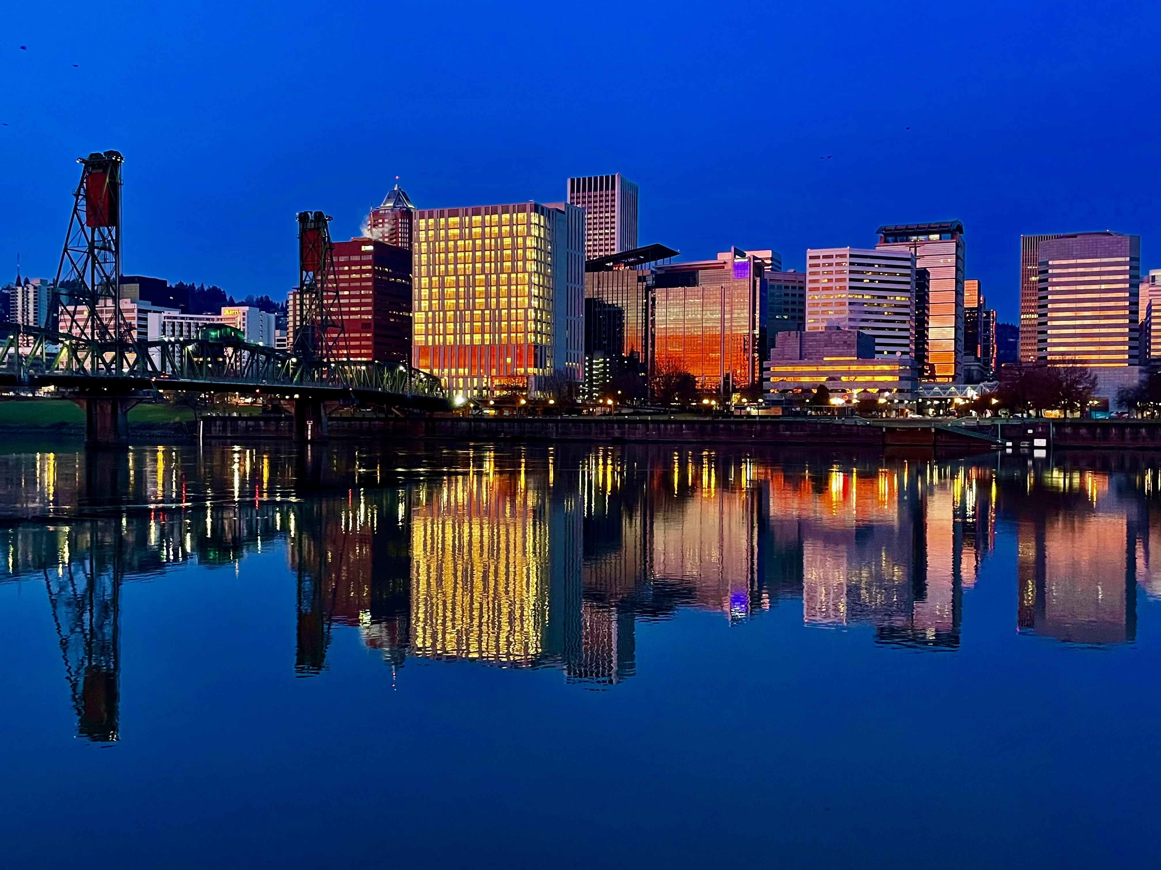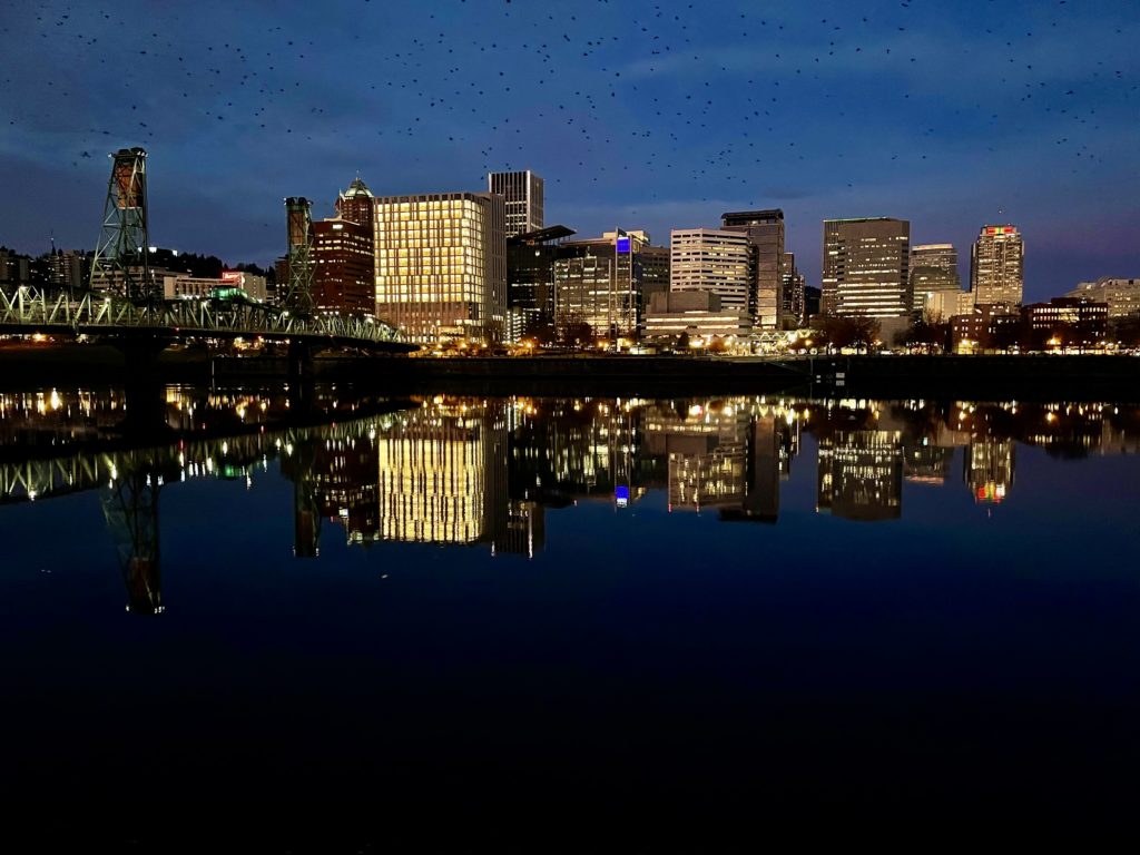 Our shoggling crew meets in downtown Portland (Oregon) at 7:00 AM, which at this latitude this time of year means it is still dark when we get started. The benefit of this is: a) no one else is around, and b) the occasional calm weather delivers amazing, jaw-dropping vistas.