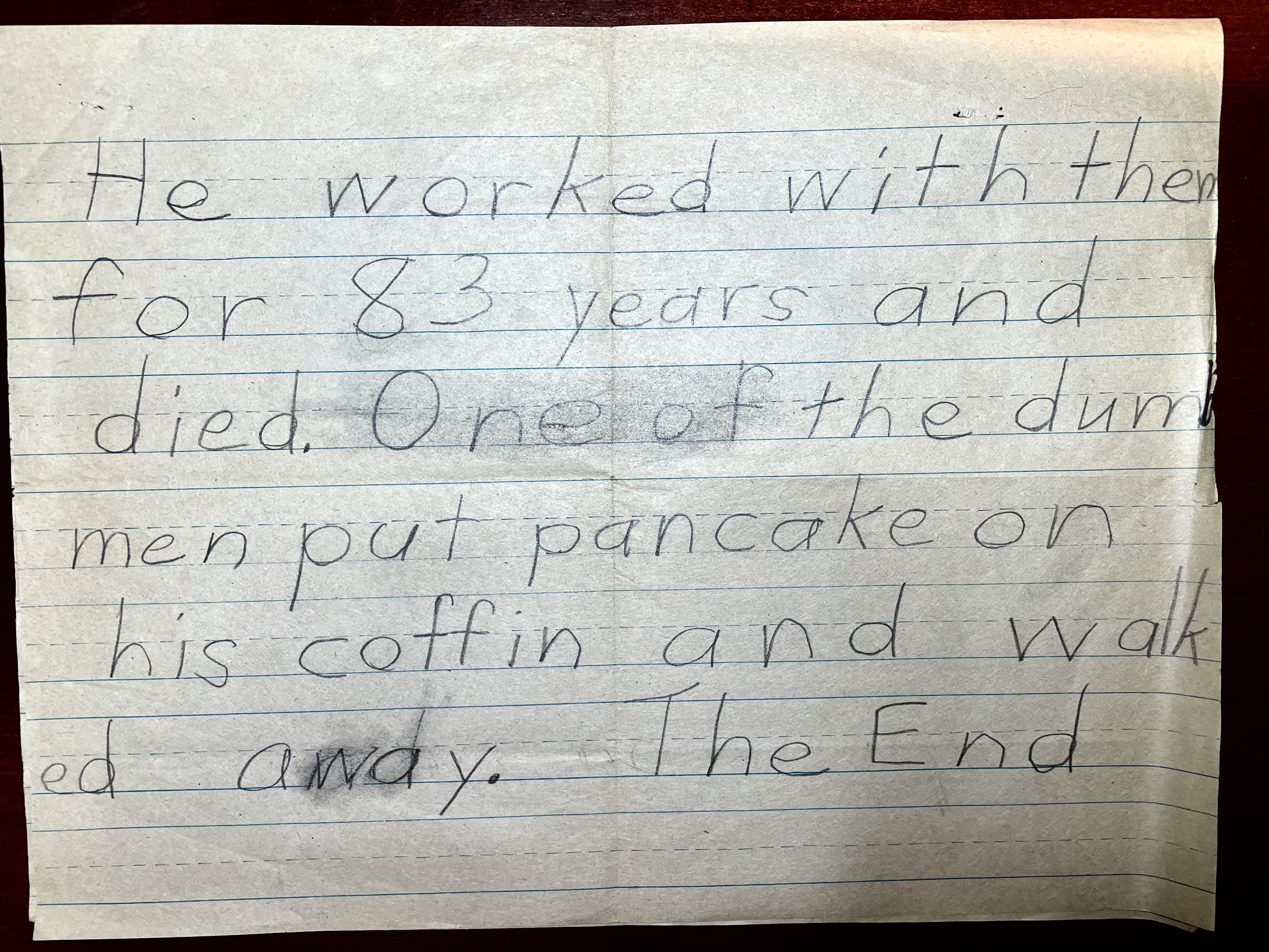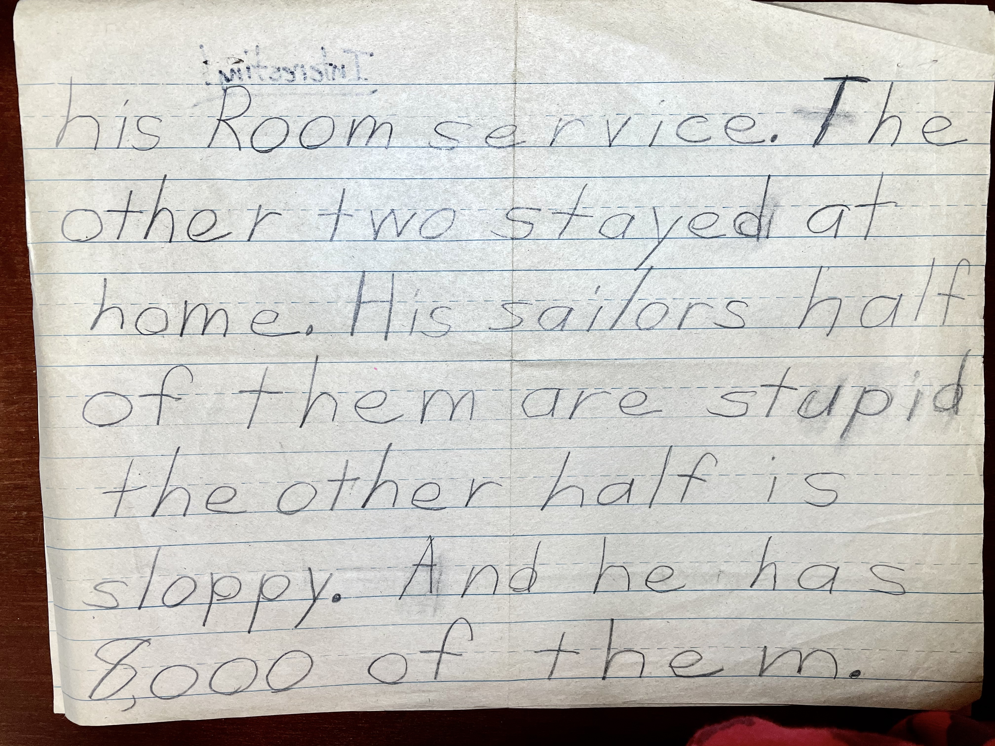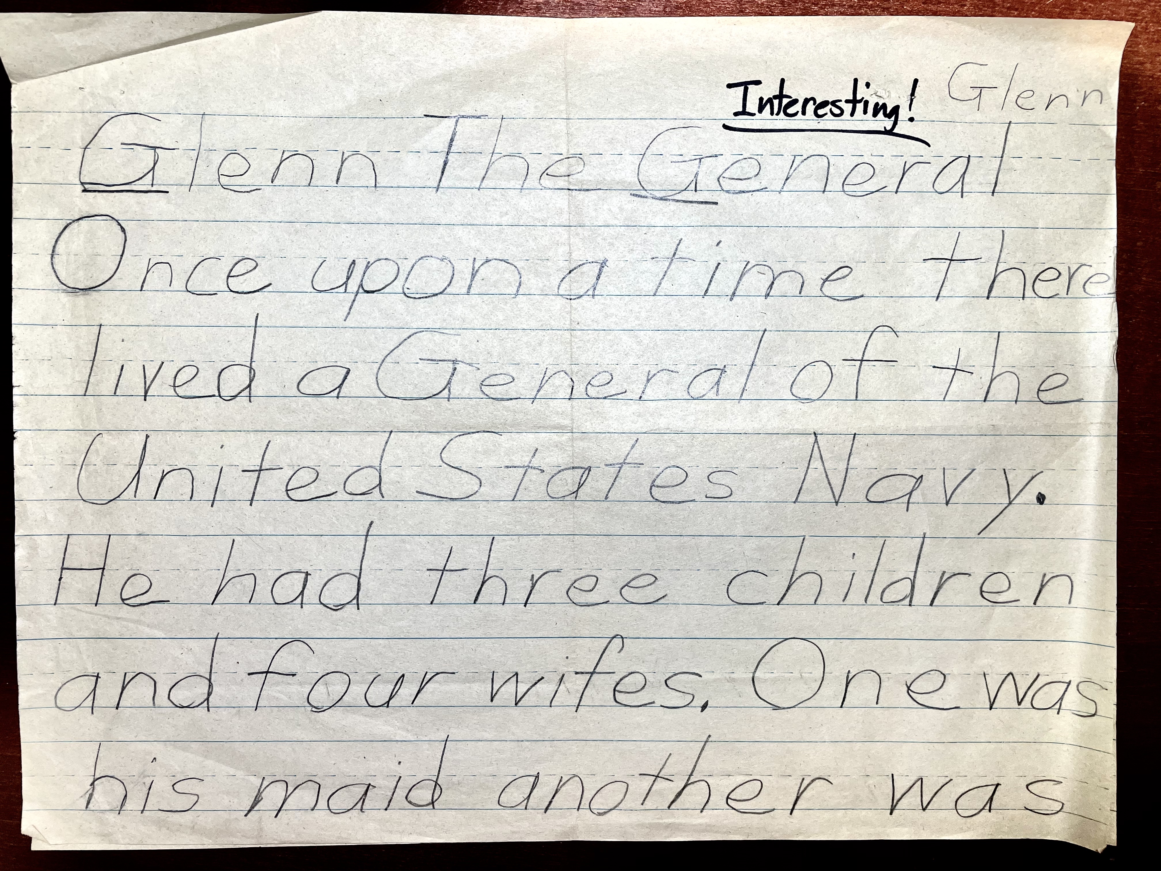 Glenn’s older brother was also doing some spelunking of his own into old things and found a story Glenn wrote when he was a small child. Glenn was an early bloomer when it came to reading and writing and he thinks he was about 5 years old when he came up with this gem (the teacher’s response cracks me up)!