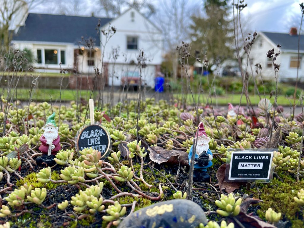 The other day I happened upon this cute display of miniature gnomes with Black Lives Matter signs in a little garden of succulents. This gave me a little chuckle…but it also reinforced for me the importance of continuing the fight for racial justice. Yard signs and a Black woman as vice president does not mean that racism and white supremacy has been dismantled. Far from it.