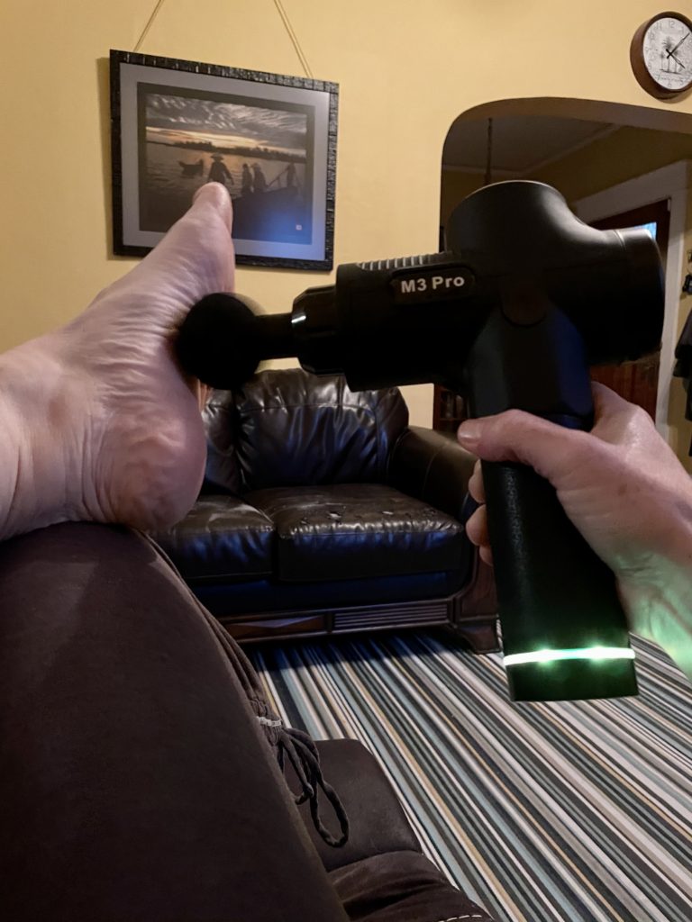 Since about May I’ve been suffering with plantar fasciitis. If you don’t know what that is, consider yourself lucky! I have tried most everything to combat it. I am awash with all sorts of spikey balls and rollers, heating pads, ice packs, orthotics, special insoles, splints, ointments and lasers. My condition has gradually improved and the addition of a massage gun to my daily treatments helped me make the biggest gains toward reducing the pain.