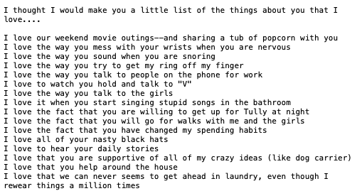 My list went on an on (and got decidedly more juicy and embarrassing!), but you get the idea. Many of these things are still true. Although, I must admit, I’m less enamored of his nasty hats and snoring these days. And, more importantly, I no longer share my movie popcorn (drenched in nutritional yeast) with anyone, not even Glenn!