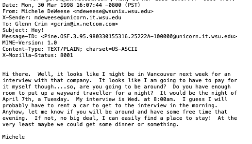 We reconnected at a friend’s wedding to discover that I was finishing graduate school in Washington and the previous year he had moved to Washington for work. Not long after I got a job interview where he lived. I was a poor student in need of a free place to stay and some help getting to a job interview, so I sent Glenn an email to see if he could help me out.
