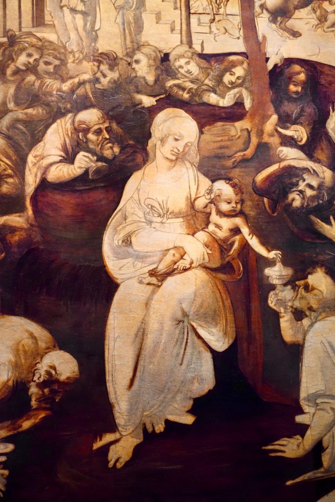 I enjoyed seeing Leonardo da Vinci’s half-finished “Adoration of the Magi” (painted around 1481). It was interesting to get a glimpse of how these paintings came together. This is a zoomed-in photo, the full painting is quite large.