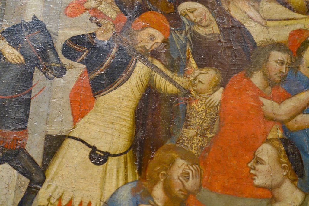 This is a zoomed in portion of one painting for which the caption read “the scenes unfold with such liveliness and attention to detail that the panel could have been taken from a modern illustrated children’s book.” A children’s book of horrors, maybe!?!