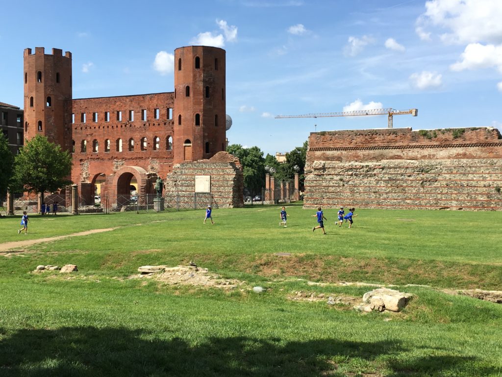 Kids playing tag in front of the (~2,000 year old!) Palatine Towers forming the old city gate in Turin.