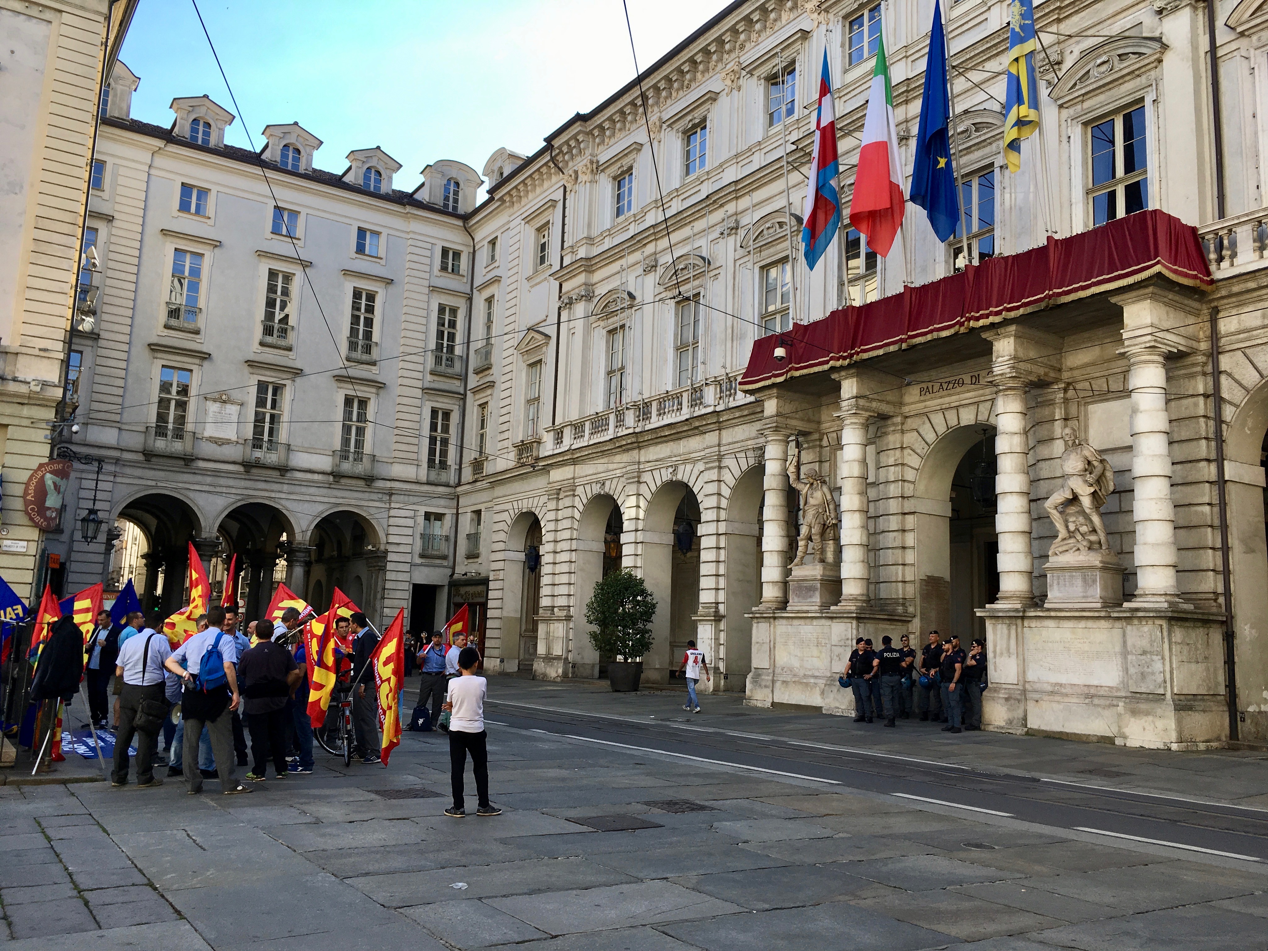 Protesters and police taking up their respective stations at city hall in Turin. They seemed more interested in chatting and laughing amongst themselves than anything else.
