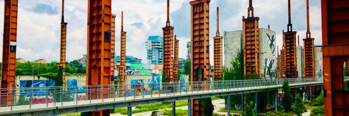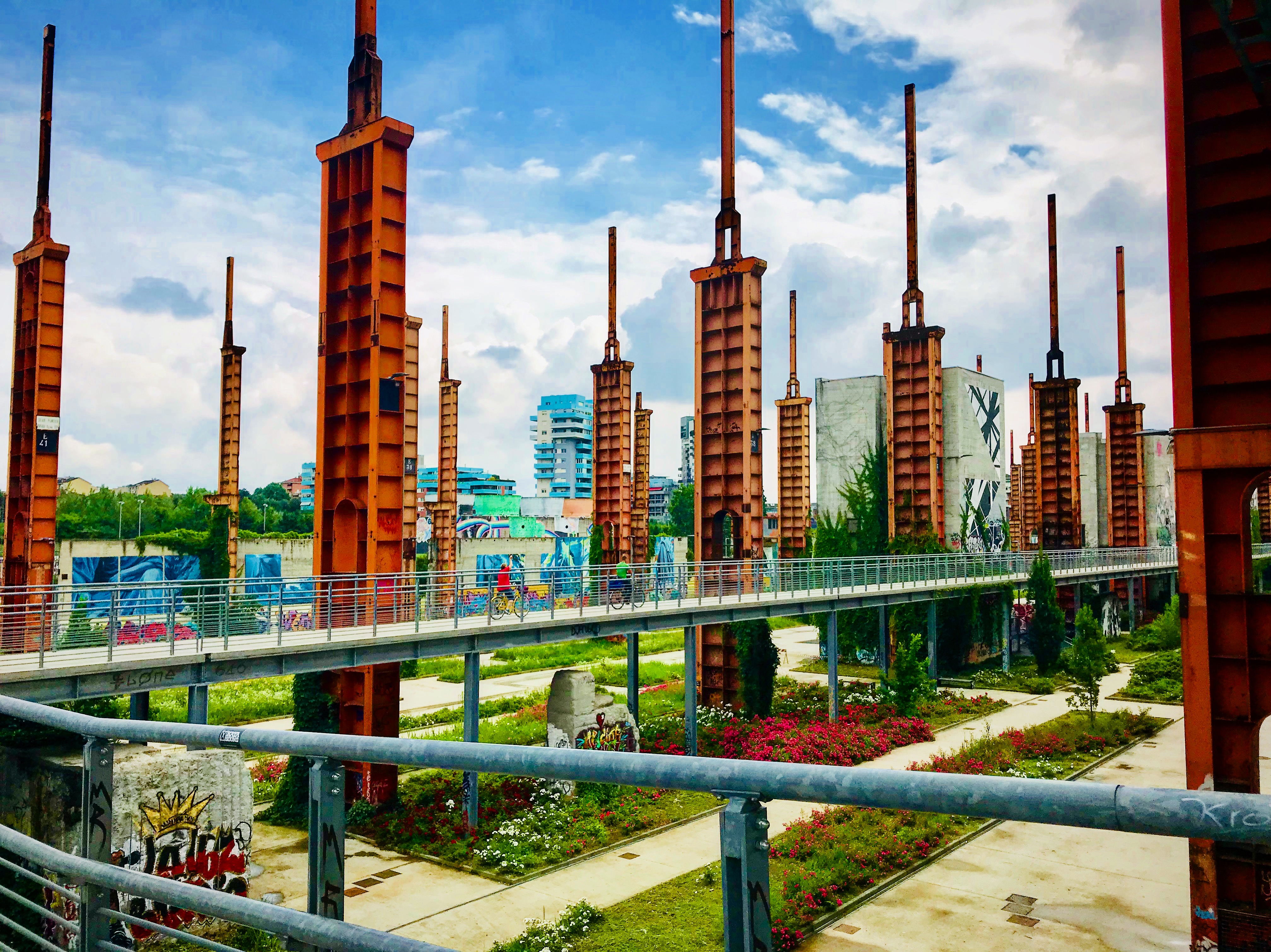 The structural beams of an old car-related factory were left standing and were repurposed into a park. If you look closely you can see me in a red shirt riding a bike along the elevated walkway. (Photo Credit: Denver Igarta)