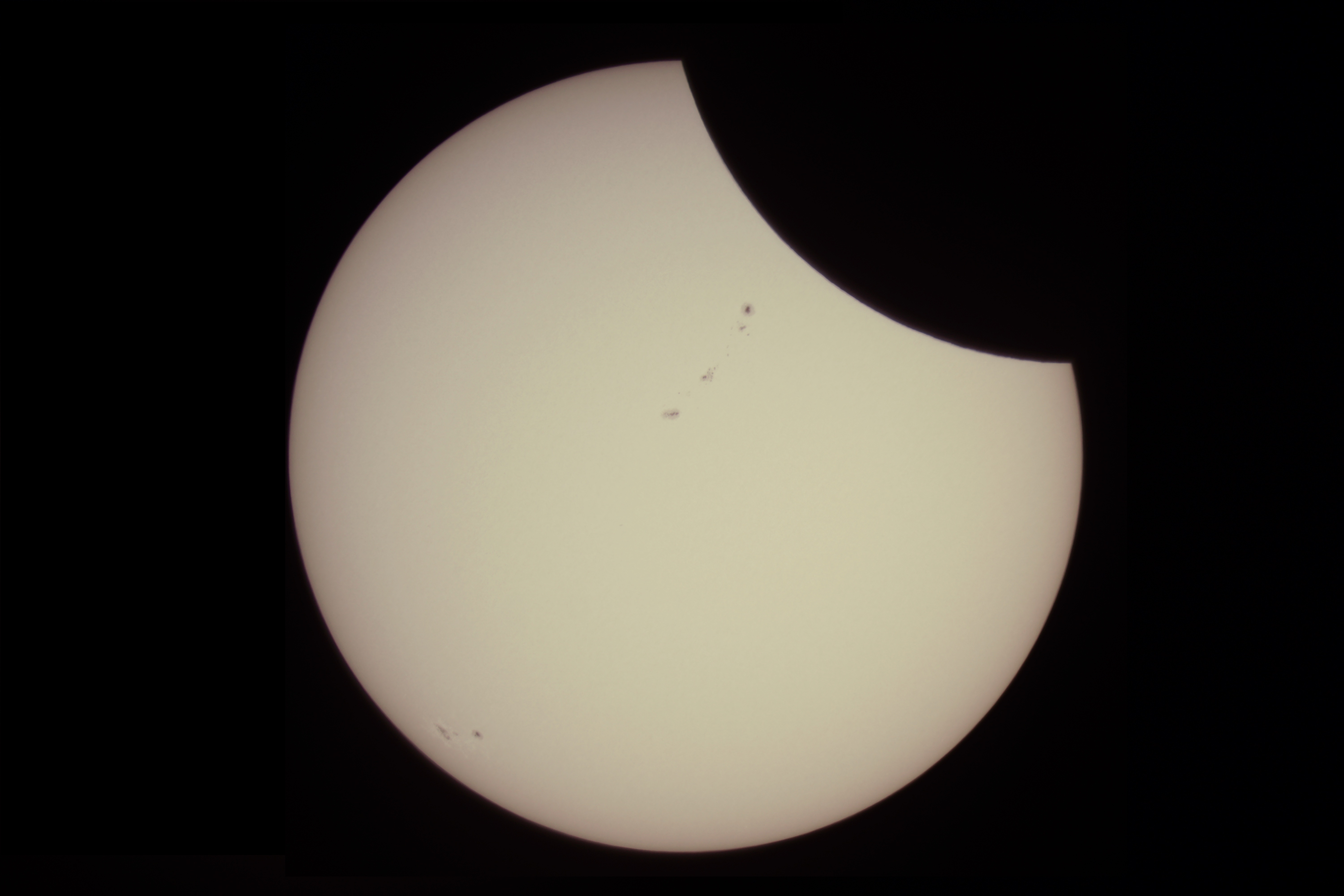 The moon beginning to march across the surface of the sun. You can see a line of sun spots waiting to disappear. (Photo credit: Christopher Crim)
