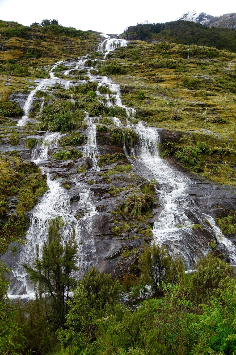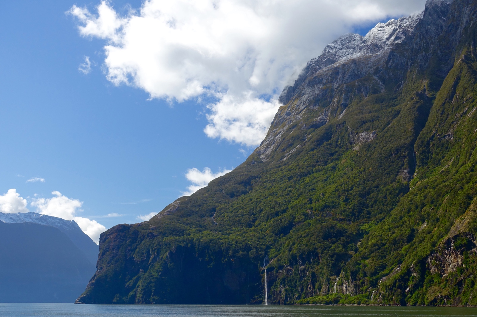 The waiting game we played in Te Anau paid off in that we enjoyed a beautiful sunny day aboard a sightseeing boat while visiting the fiord. It was the first time in over 10 days that there was a break in the rain. One of the many benefits of being there right after the rains is seeing countless temporary waterfalls (falls that dry up when it isn’t raining) all along the fiord cliffs.