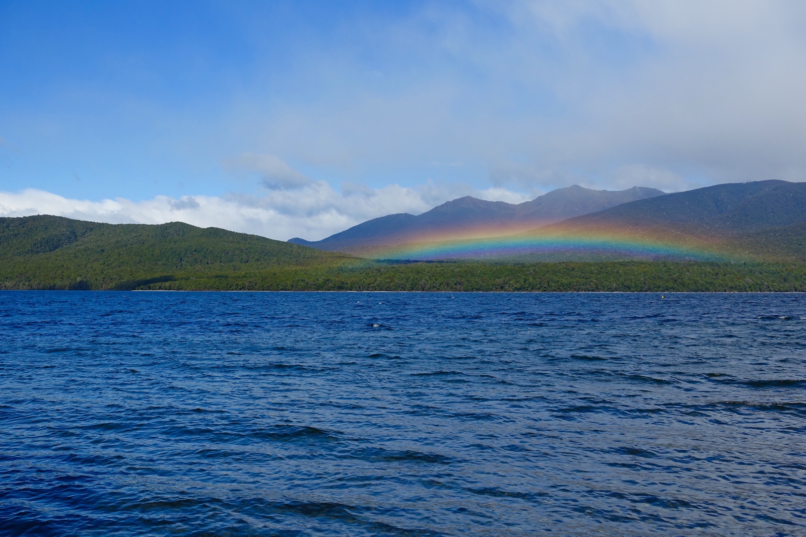 We ventured out between downpours and were often treated to beautiful sights like this rainbow over Lake Te Anau.