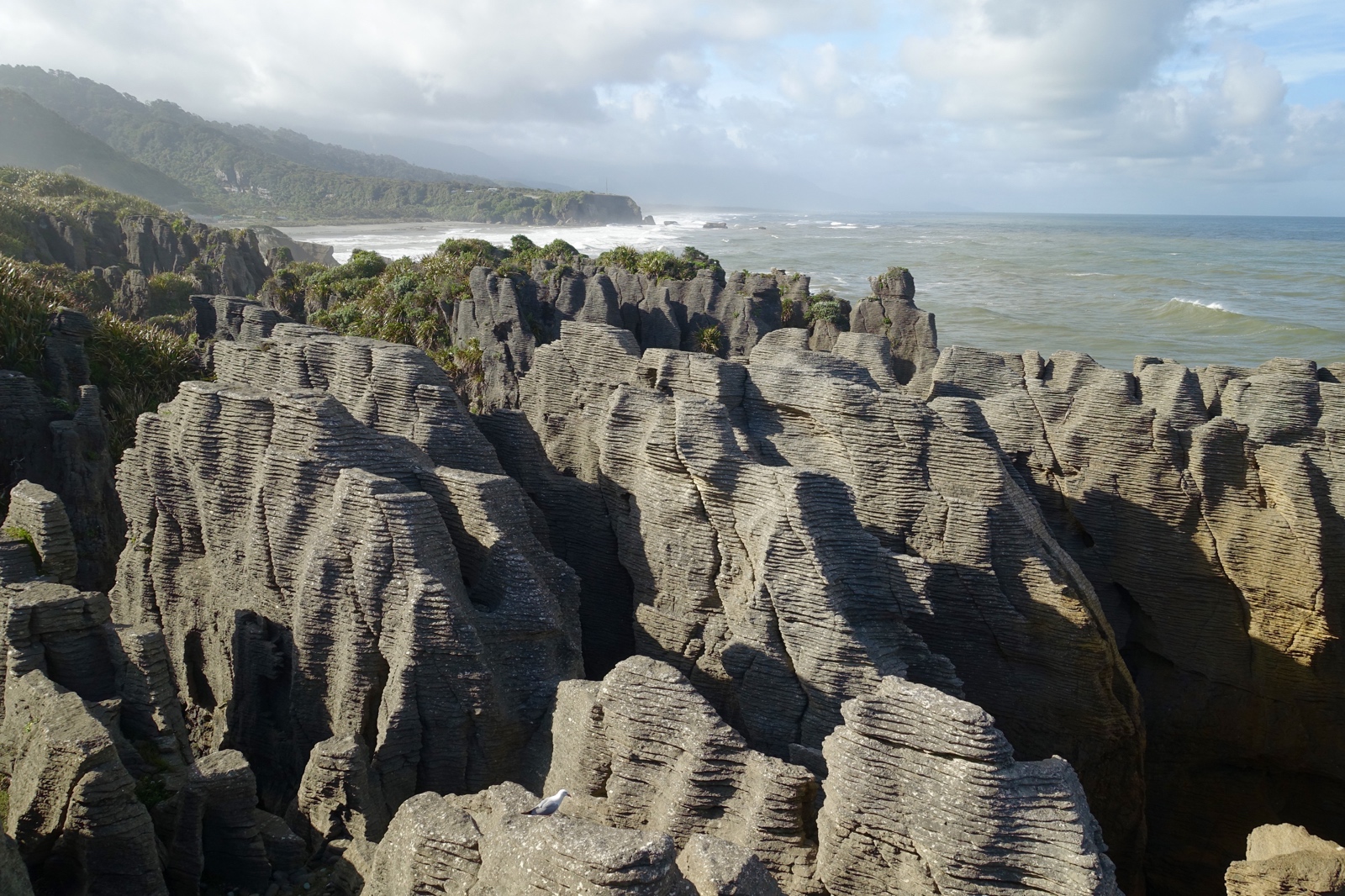 We camped near Fox Glacier and Franz Joseph Glacier, but again, the rainclouds, floods and washed out roads prevented us from seeing these magnificent sights. Rather than waiting for the weather to clear we decided to forego the glaciers and continue north toward Punakaiki, a town famous for their unusual “pancake rock” formations. Glenn is a huge fan of pancakes so he was sure this was a sight we needed to see as soon as possible.