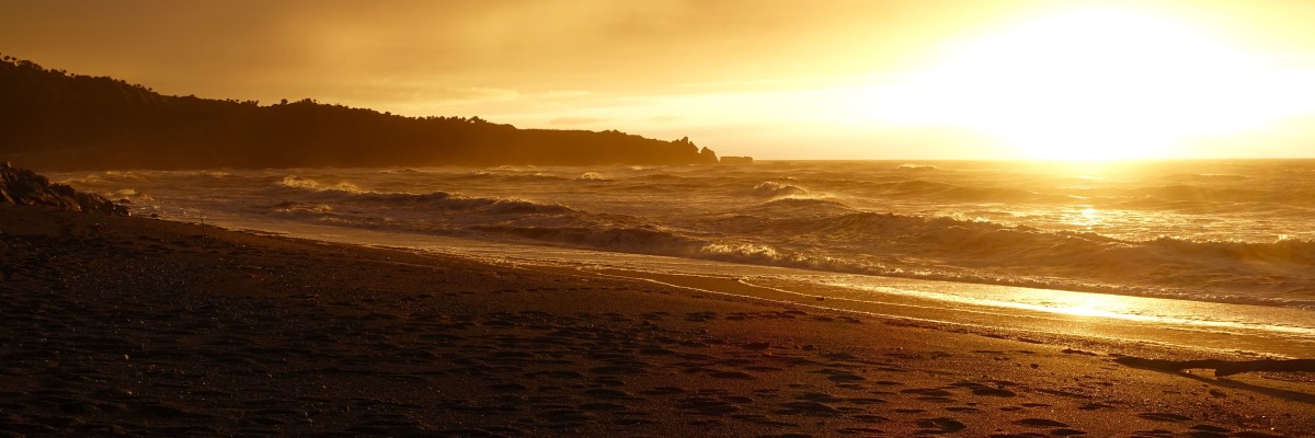 The rain clouds finally passed and gave us this beautiful sunset with the pancake rocks silhouetted in the distance.