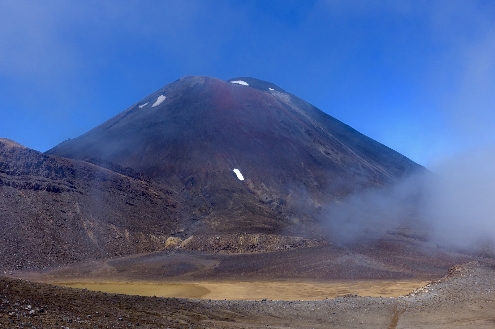 I sat in the freezing wind for 15 minutes waiting for the clouds to clear so I could get this shot of all three of the volcanoes (Red Crater of Mt. Tongariro, the tall cone of Mt. Ngauruhoe and the snow covered peaks of Ruapehu). It was visible for about 8 seconds and then the clouds quickly gobbled them up again.