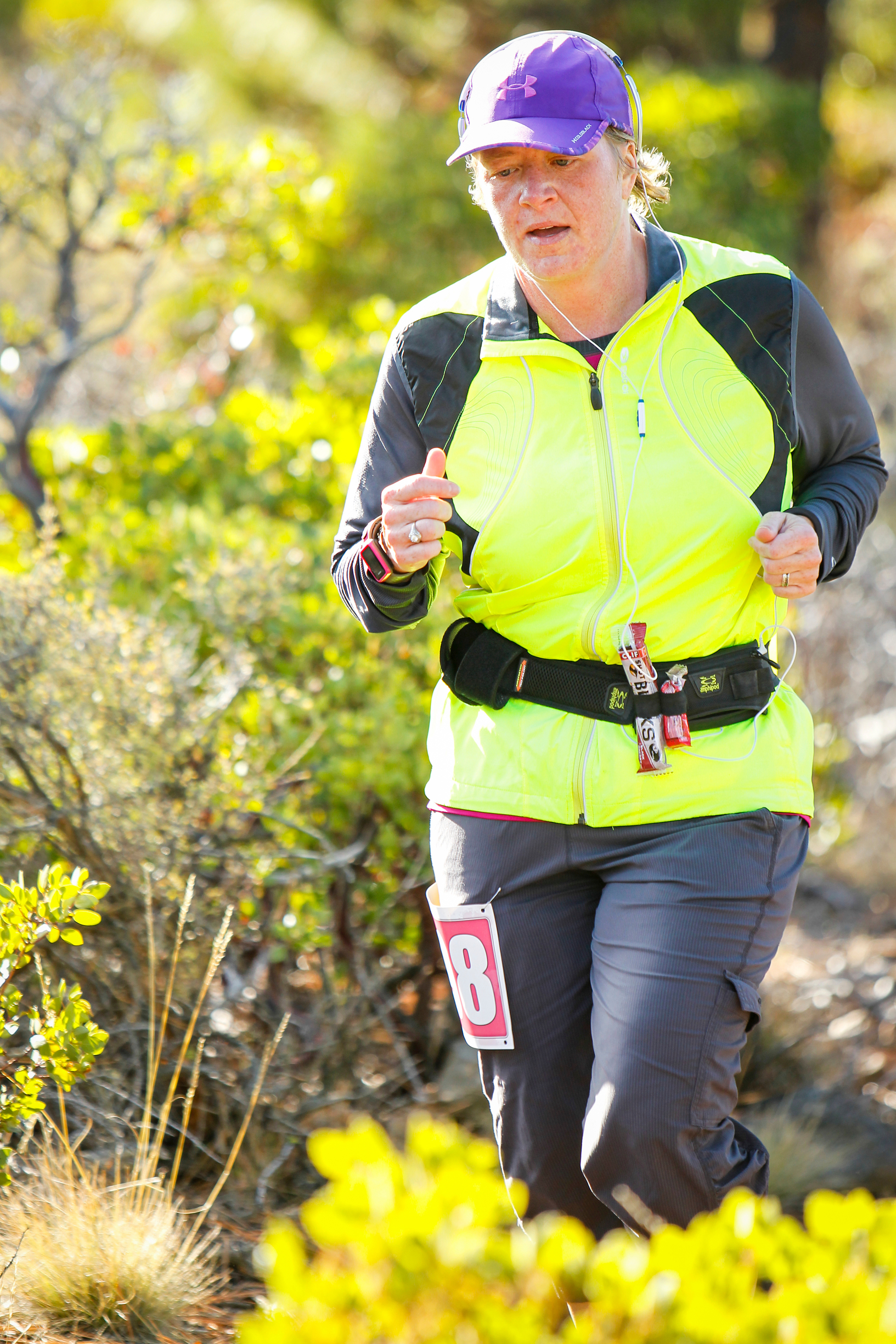 At about mile four I started to feel a little hemmed in by the slower pace of a woman ahead of me on the trail. I decided to go off-road, bounding over low bushes and rocks, and sprinted ahead to pass. Once I was out front I picked up the pace to make up for some lost time.