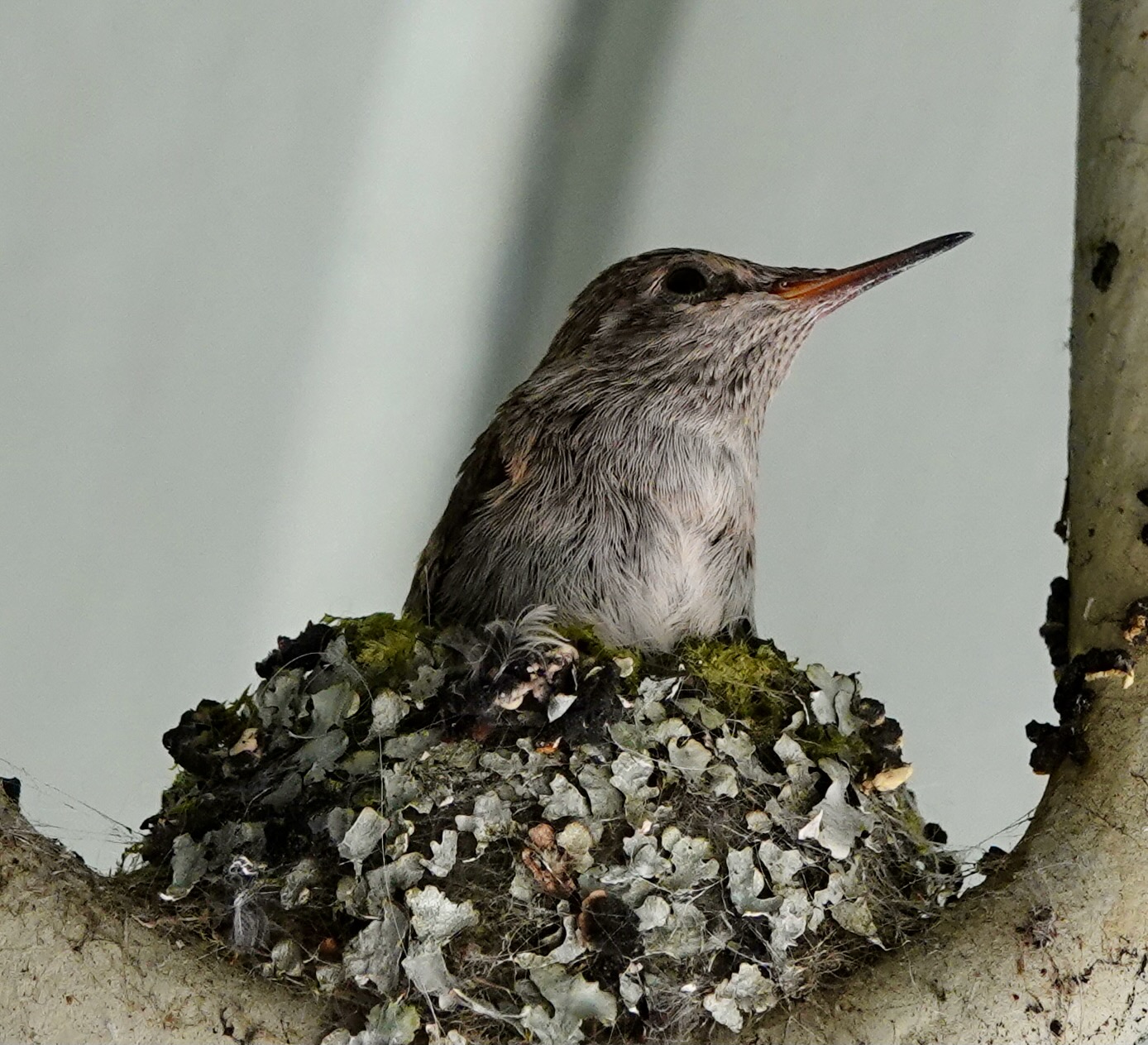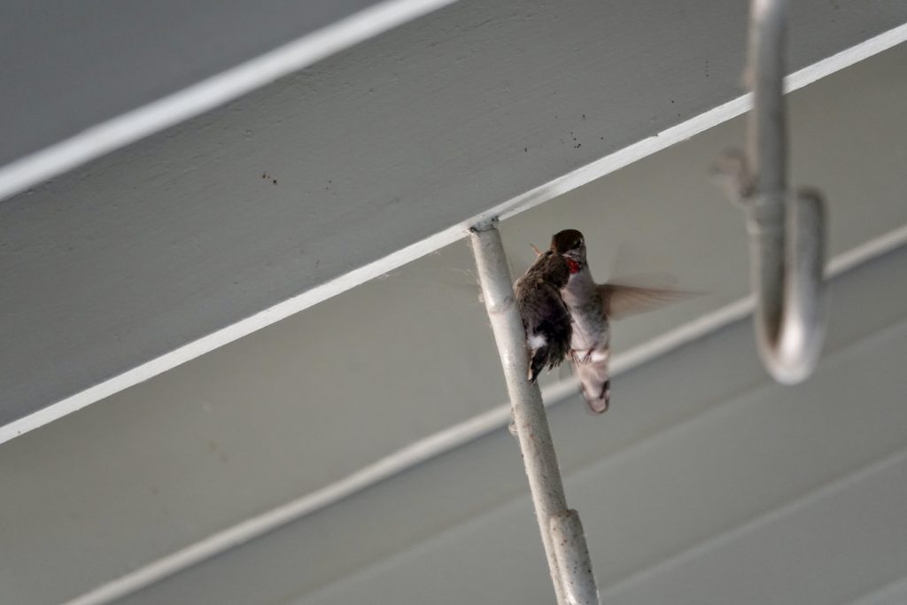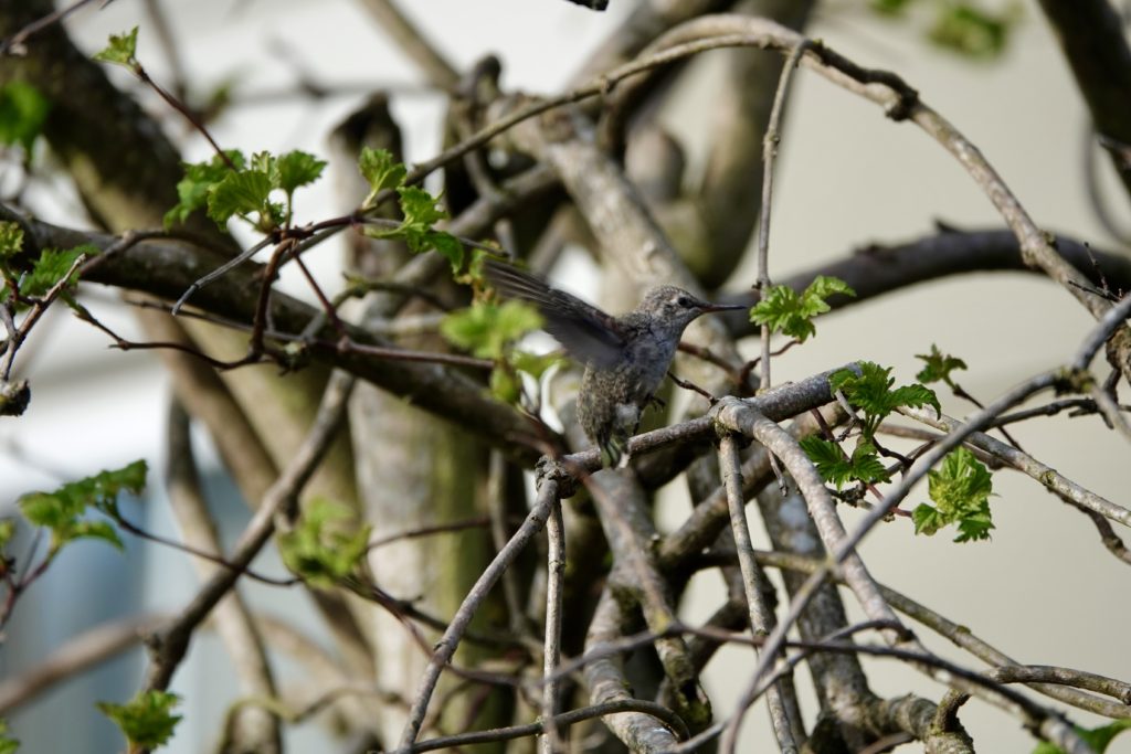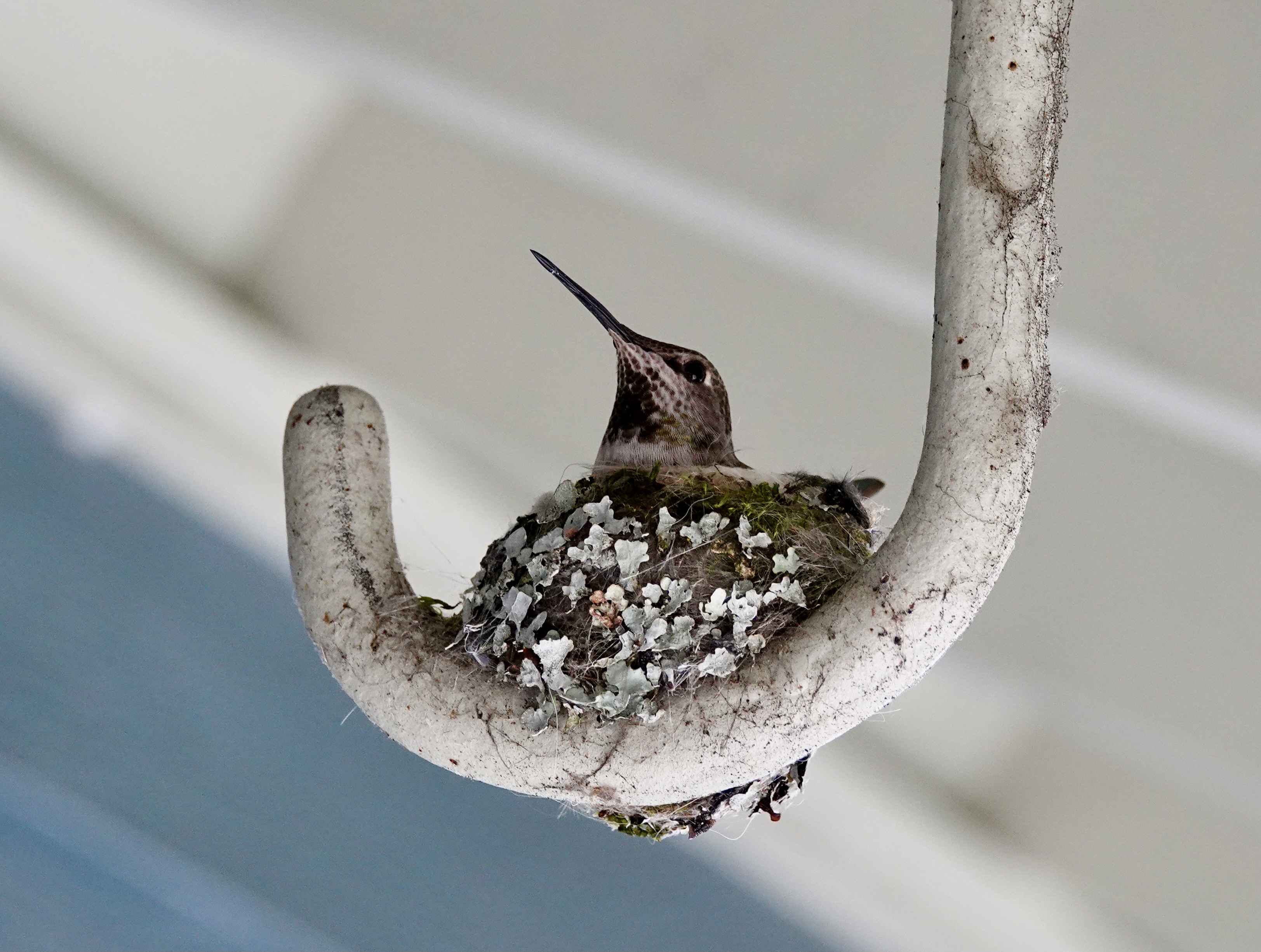 I had been thinking it was time to put my hummingbird feeders out because I could hear so many of them flying overhead when sitting on the back porch drinking my morning tea. It wasn’t until a few days later that I realized it wasn’t a bunch of hummers, but was instead a single female Anna’s Hummingbird busily flying back and forth building a nest.
