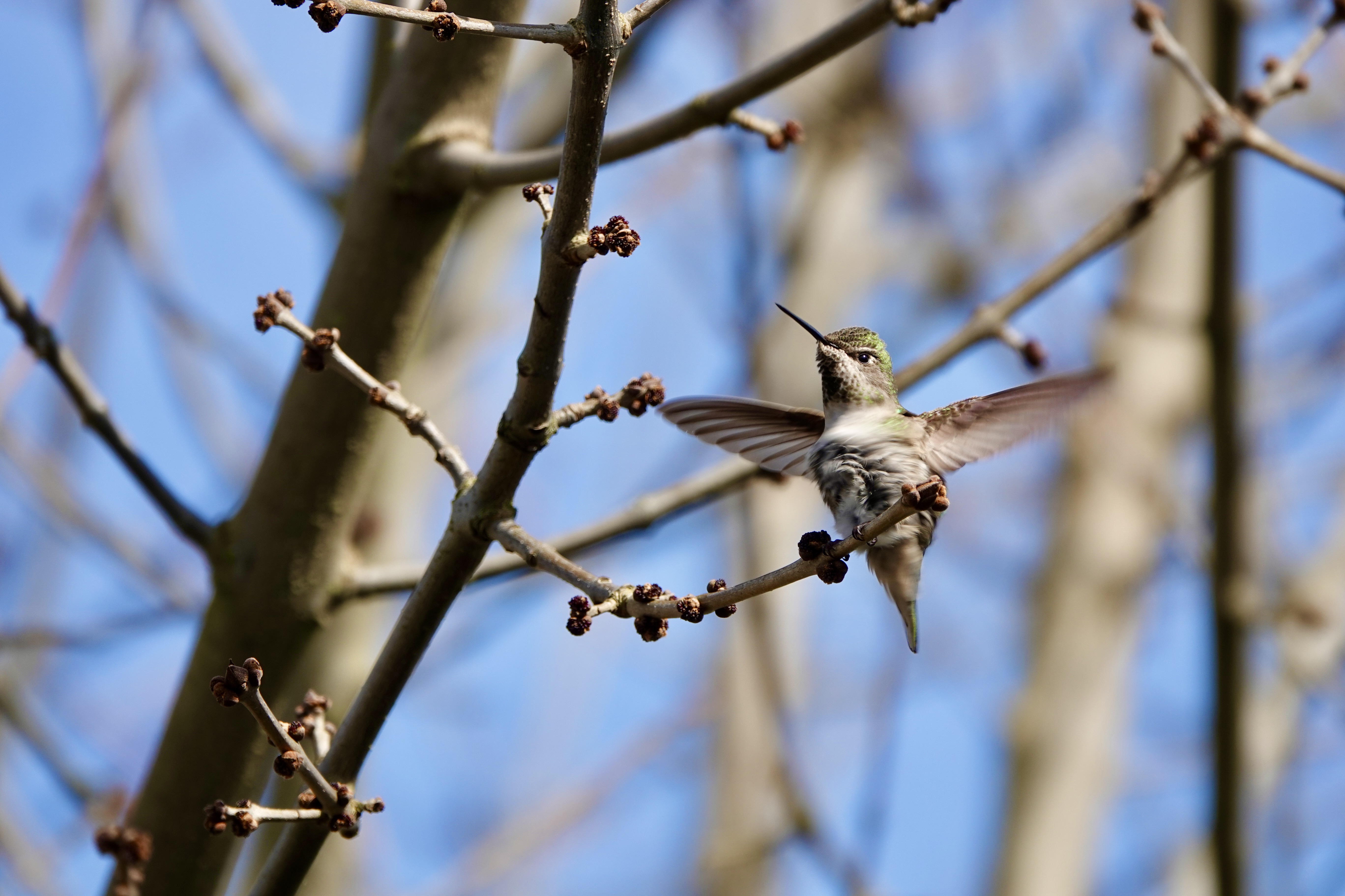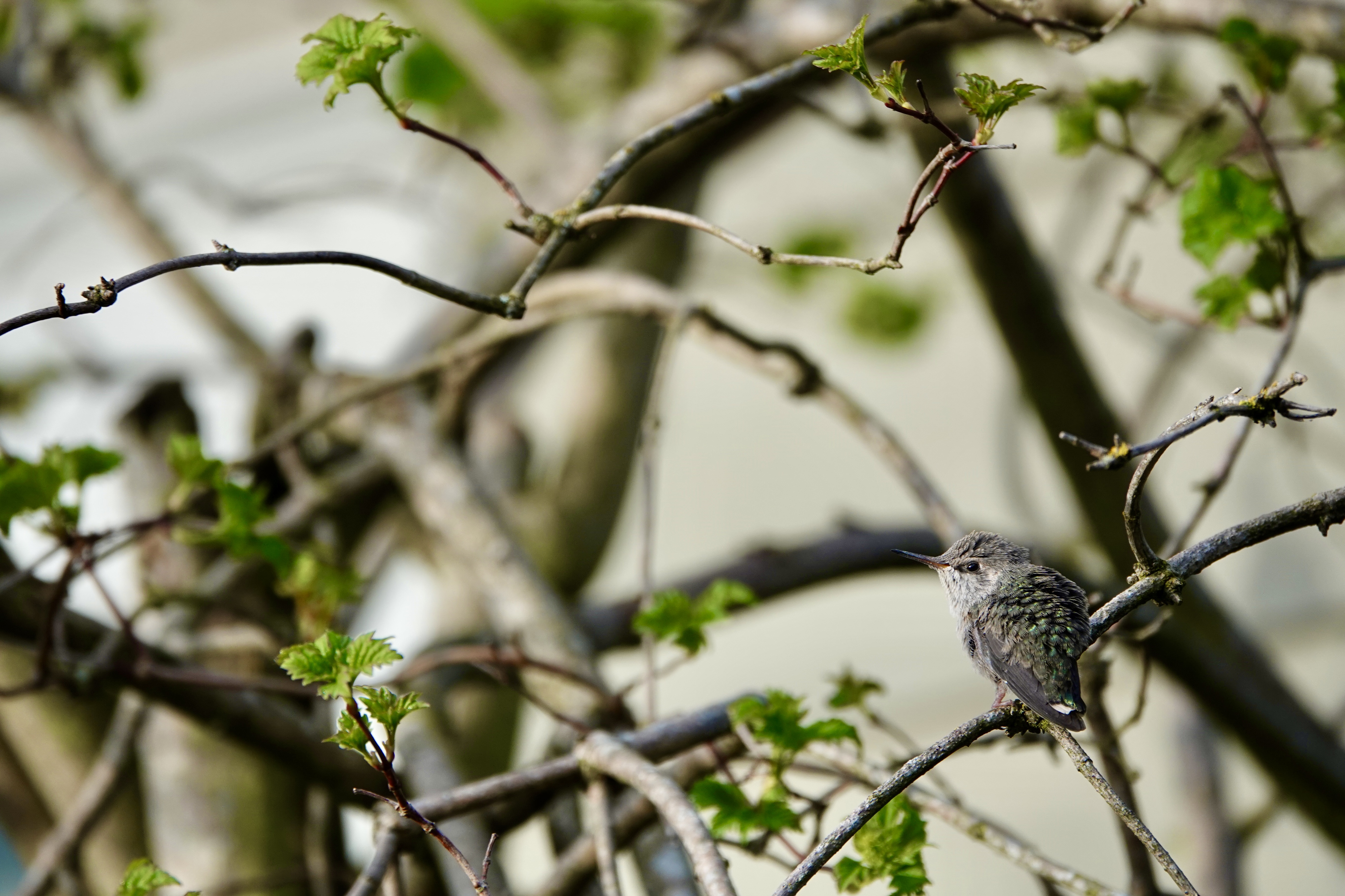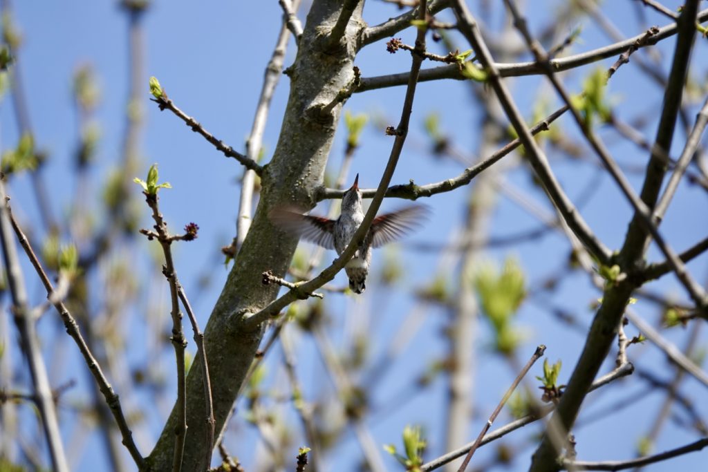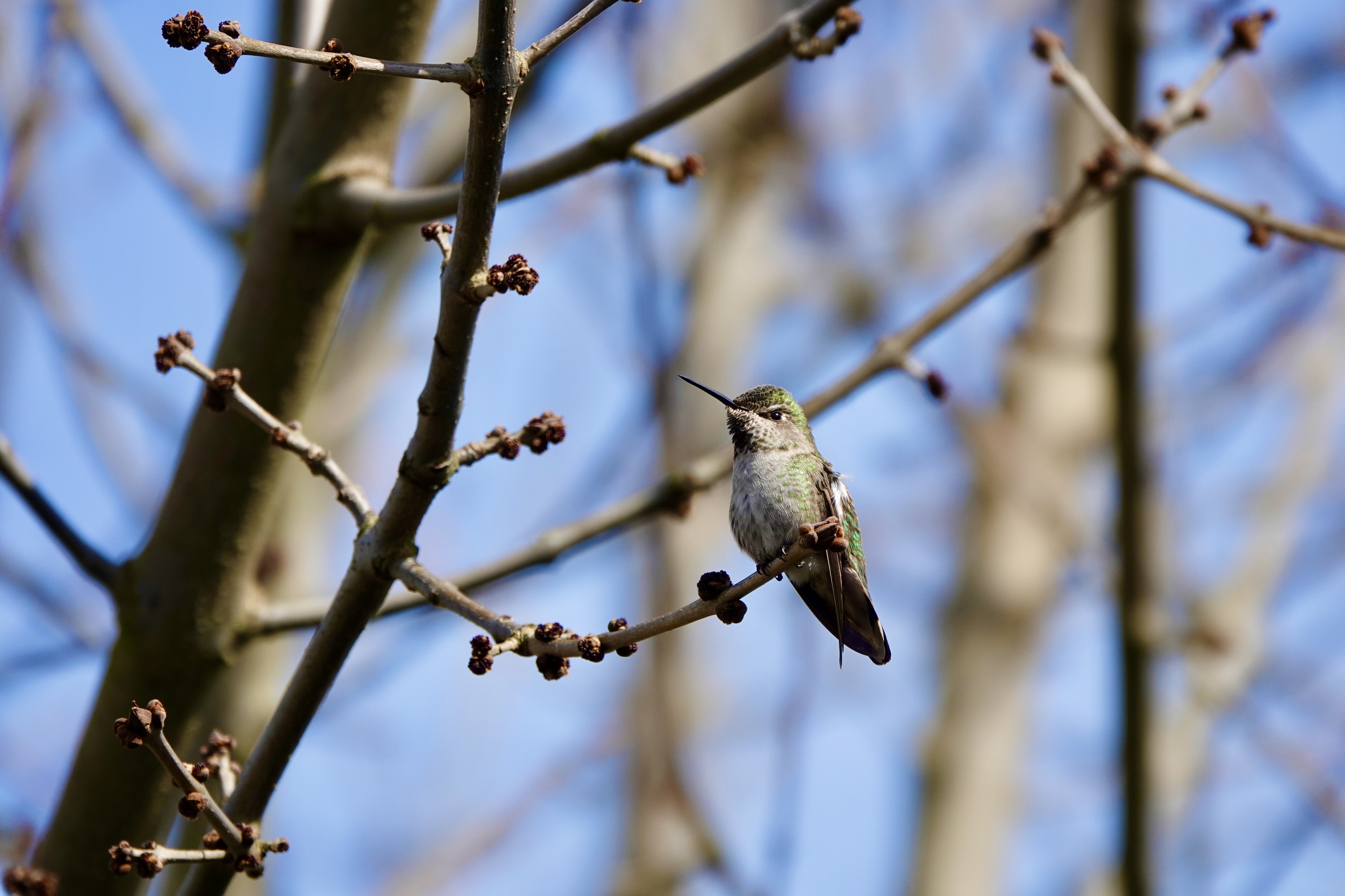 I had been thinking it was time to put my hummingbird feeders out because I could hear so many of them flying overhead when sitting on the back porch drinking my morning tea. It wasn’t until a few days later that I realized it wasn’t a bunch of hummers, but was instead a single female Anna’s Hummingbird busily flying back and forth building a nest.