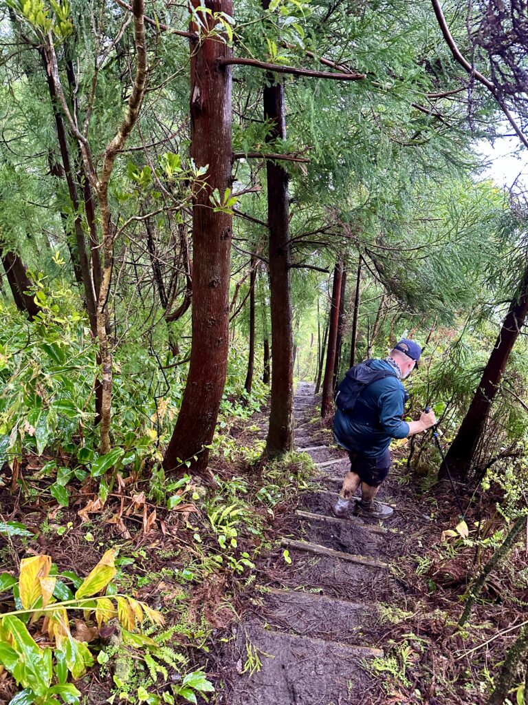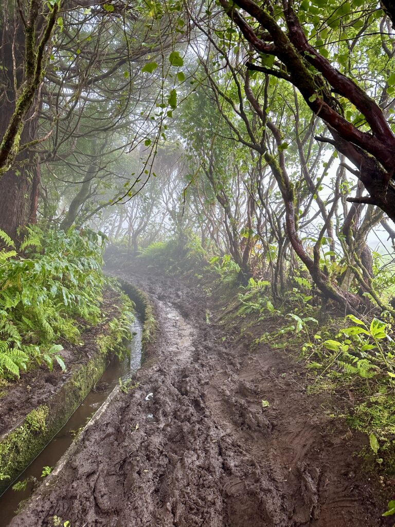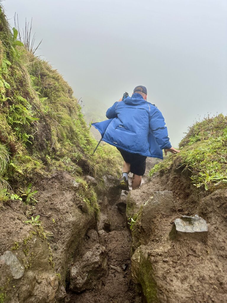 In many ways, the lack of a view…and the intensity of the mud…made me hyper-focused on only my most immediate surroundings. A barbed wire fence on one side, and a precipitous drop far down into the mouth of the volcano on the other, meant I could only be worried about the next step in front of me. All my other worries, doubts, and expectations simply dropped away.