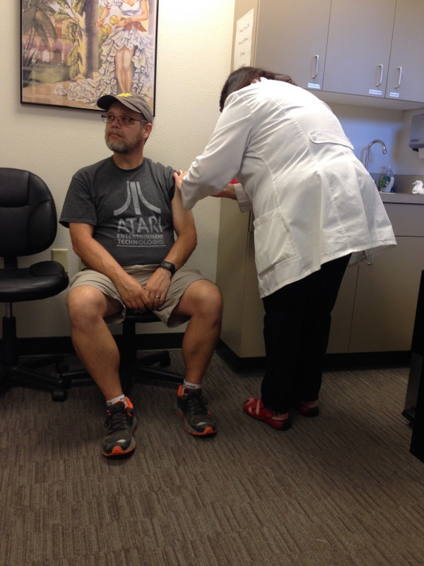 Getting our travel vaccines – never fun! (you’ll be seeing a lot of this shirt…one of a few Glenn has packed)